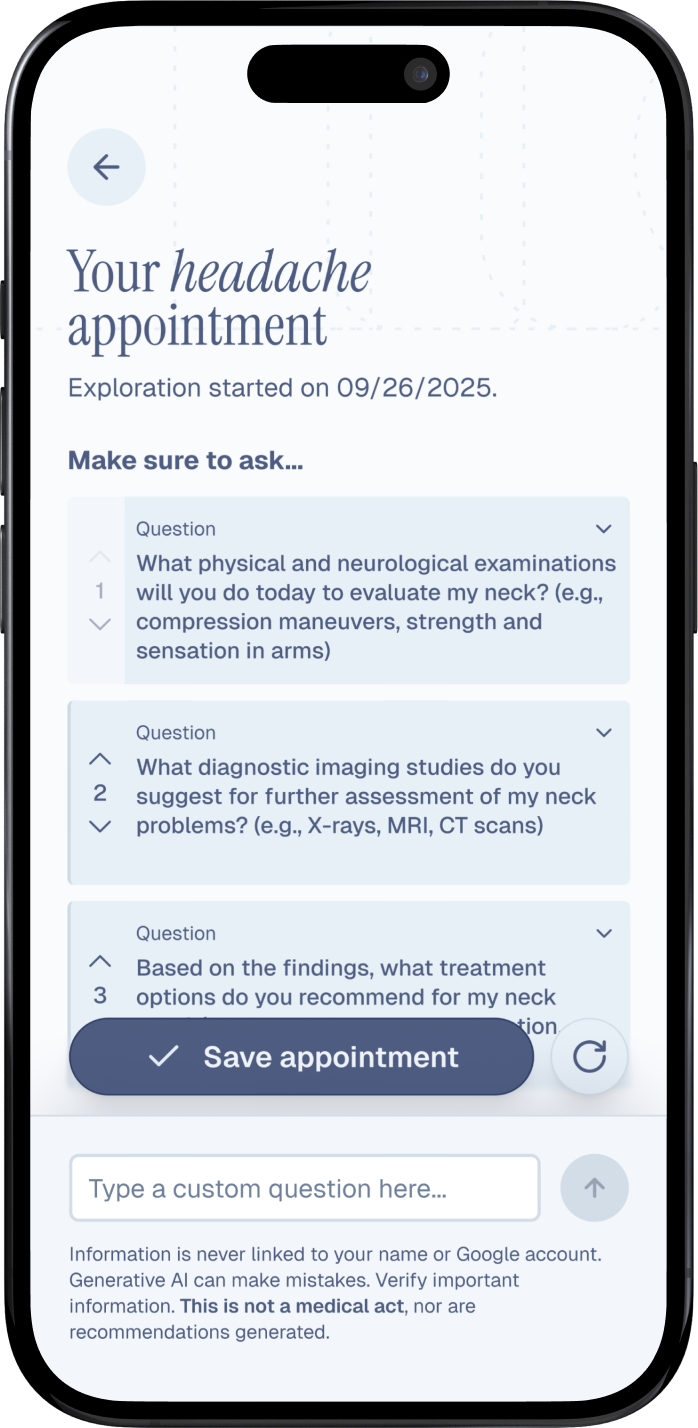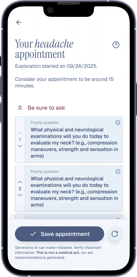 With a design focused on simplicity and speed, Redi helps you prepare for your appointment in minutes — faster and easier than using general AI tools